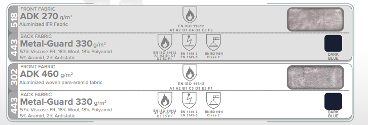 EN ISO 11612, EN 1149 and EN ISO 11611 certified aluminized jacket & trousers are designed to protect the wearer against high radiant, convective and contact heat, and consist of front fabric and back fabric available with 2 layer options.